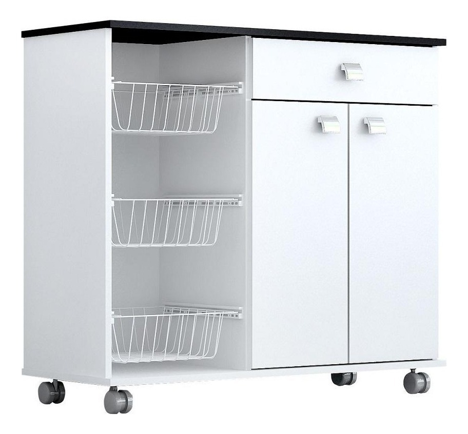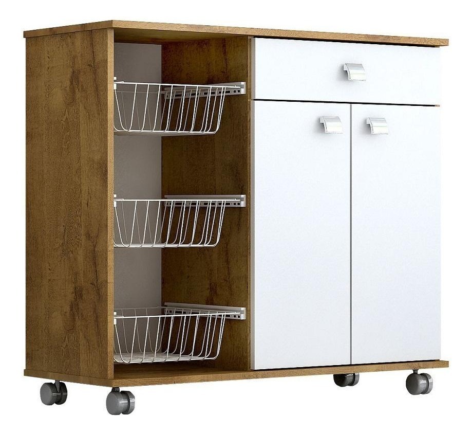 A Fruteira Isis é um móvel versátil e funcional projetado para armazenar e organizar frutas, legumes e outros alimentos frescos. Conta com duas portas que se abrem para revelar um amplo espaço interno, além de uma gaveta ideal para armazenar itens menores, como talheres, guardanapos ou pequenos utensílios de cozinha. Inclui três cestos metálicos e aramados para armazenamento organizado de frutas e legumes. O design elegante e moderno do móvel adiciona um toque estético à cozinha, sendo ao mesmo tempo uma peça funcional e decorativa.